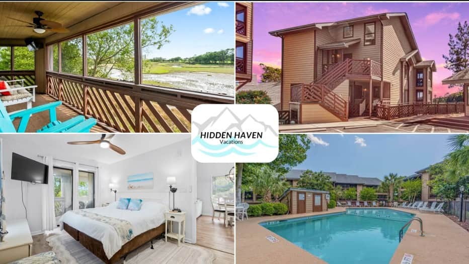 Spectacular 2 story 3-bedroom penthouse, waterfront home overlooking the inlet/marsh, Dunes Golf Course and a slight view of ocean. Just one block from the ocean/5 min walk. The home does not share connecting walls with any other unit. A wraparound, screened in balcony over looking nothing but water/marsh and a golf course. Vaulted ceilings, wet bar, 3 bedrooms, 2 baths, huge upstairs kids' room with arcade. Beautiful sunsets!